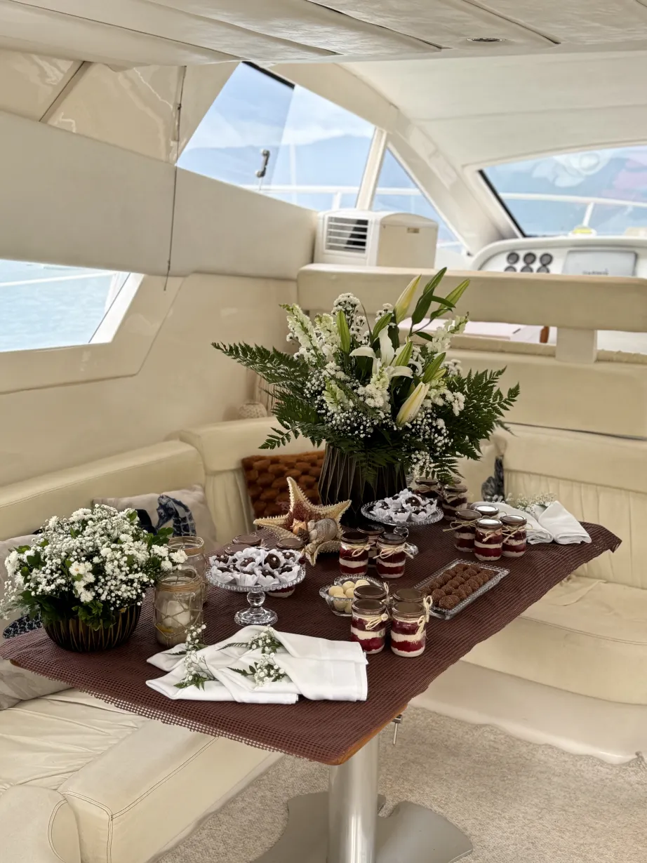 Comemore de um jeito único em um iate privativo, com a opção de serviço de bordo completo para uma experiência mais confortável. A ambientação pode seguir decoração simples ou personalizada, mantendo o foco na celebração em alto mar e no momento especial.